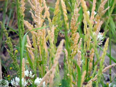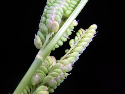 花は、春に咲く。茎頂に長さ10〜20cmの円錐花序をつけ,側枝の片側に2列,長さ2〜3mmの小穂を並べる。