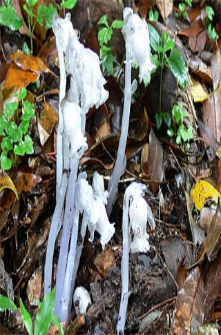 根を除いてすべて純白色で、鱗状の小さな葉が茎に密着して互生します。