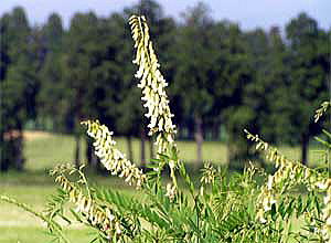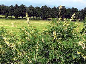 2008年5月、下り線霧島SA入り口付近で、淡黄色の蝶形花を沢山つけて群生している懸案の不明植物に出会わしました。