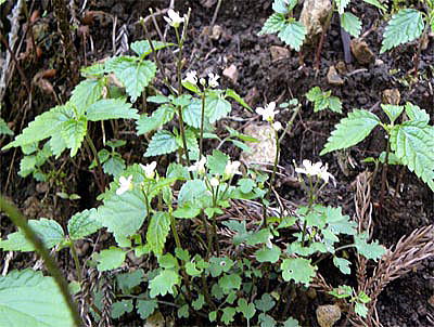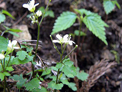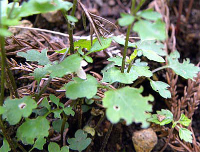 高千穂町のクマガイソウの自生している森陰で、マルバコンロンソウを見かけました。
