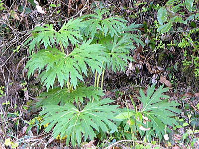 群落の藪の中をよく調べてみると、若いときは、ヤブレガサかと思うような草姿をしていることも分かりました。