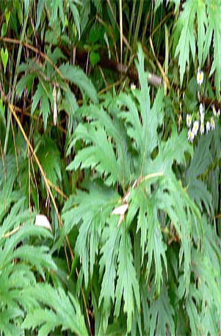 2010年4月、延岡市北川町の家田湿原の近くで、ハンカイソウの若葉を見かけましたので、写真を追加しました(6段目右の写真)。
