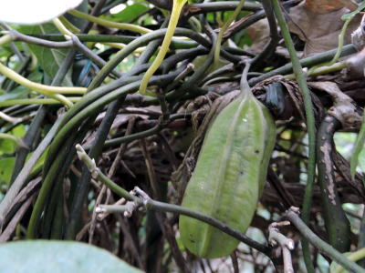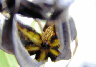 花は、 糞や腐肉に似た匂いで小型のハエをおびき寄せ、花筒の奥の球形の部屋へと誘導。部屋には柱頭があり、ハエは後戻りができずに、そこに閉じ込められ、その後、雄しべが花粉を出すと、部屋から脱出できるようになり、花粉を付けたハエは花から出ていくのだそうです。