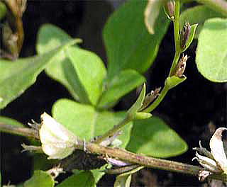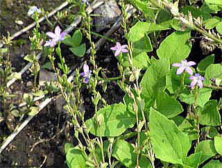花期は5〜7月で、花には、開放花と閉鎖花がある。開放花は、茎の上部の1〜数節の葉腋につき、5数性。花冠は小さく、径約5mm、紫色。