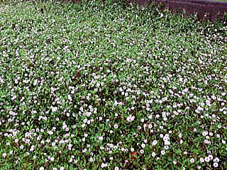 植物散策のため、訪れた県薬草・地域作物センター庁舎のグランドカバーに使われ、辺り一面を覆い尽くしている小さな植物が目にとまりました。