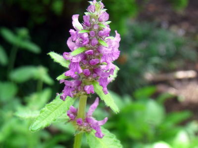 近寄って花を観察すると、シソ科の花らしく、唇形花を段状に輪生し、大変美しい紅紫色の花色です。