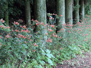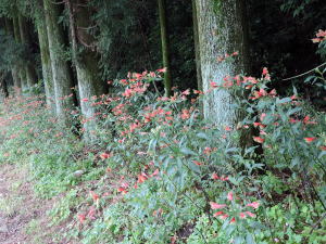 杉木立の根元を飾るかのように、たくさんのユリズイセンが緑色の茎を一斉に伸ばし、赤い花を咲かせている様子を撮影しました。