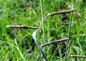 花は、夏から秋,茎頂に長さ5〜10cmの枝穂が3〜5個間隔をおいてつき,下向きの小穂が2列に並ぶ。