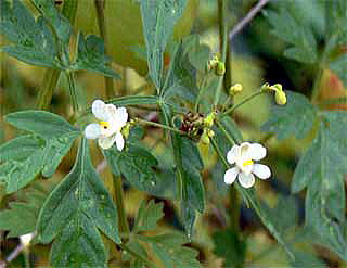 花は夏に咲き,花弁4枚は大きさ不同,下に巻ひげが対生する。