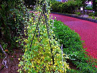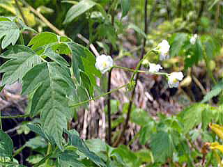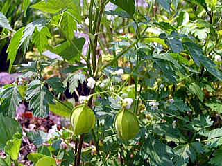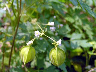 本来は、薬草 (黄疸・疱瘡用)でしょうが、園芸種として花を観賞するよりも、フウセン状の果実をつけ、涼感のある草姿が好まれ、夏に日除けとして、家の回りに植えられることの多い植物のようです。