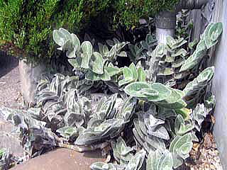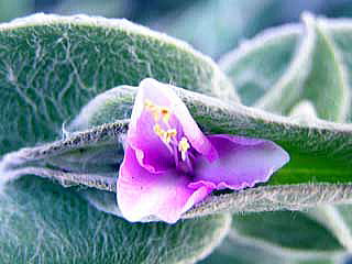 株全体が白い柔毛で覆われ、蔓性で、地面を這って広がります。 流通名「ホワイトベルベット」の名のとおり、白いベルベットのような植物です。