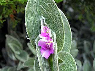 園芸種ですが、ムラサキツユクサの花に似た多肉質の珍しい異様な植物を見かけましたので、掲載しました。