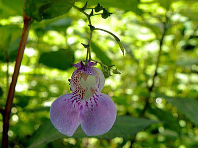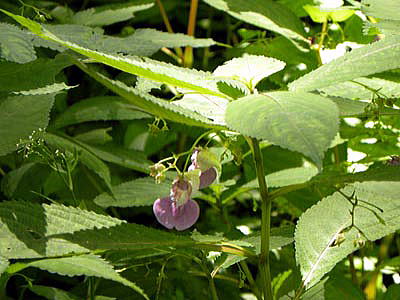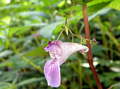 夏から秋にかけて咲く紅紫色のツリフネソウ(ムラサキツリフネ)は、2004年10月に、県道30号線沿線(えびの市)で撮影し、別ページに掲載していますが、偶然、薄紅色のハガクレツリフネの撮影機会に恵まれました。
