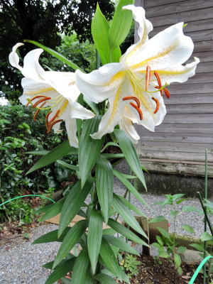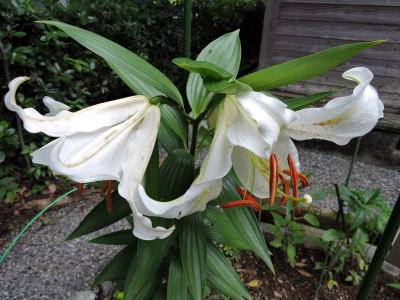 都城市早水公園緑の相談所前庭の薬草コーナーで、ヤマユリに似ていますが、ヤマユリよりずっと大きな花を咲かせているユリを観察しました。