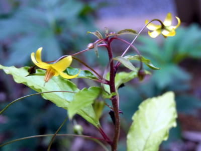 写真のとおり、花冠は黄色で5裂し、下向きに咲く美しい花です。