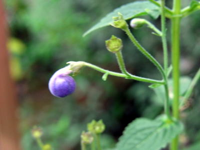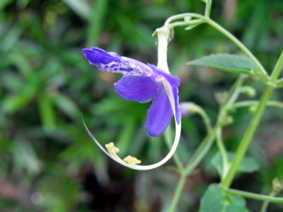 図鑑で調べたところ、花形から、別名帆掛草(ほかけそう)ともいい、花冠の筒部から 4本の雄しべと雌しべが花外に出て弓形に曲がっており、特徴のある花です。