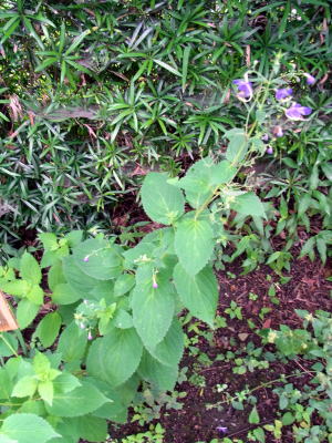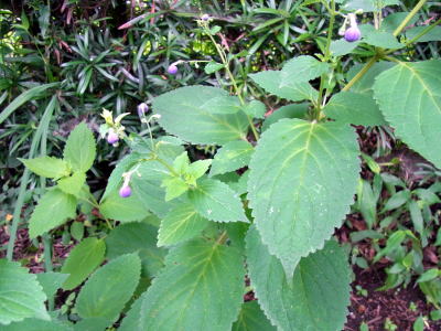 茎は四角く、上部で分枝し、高さ1m内外,葉は長さ1~4cmの柄で対生し,長さ5~13cm,幅4~8cmの広卵形。