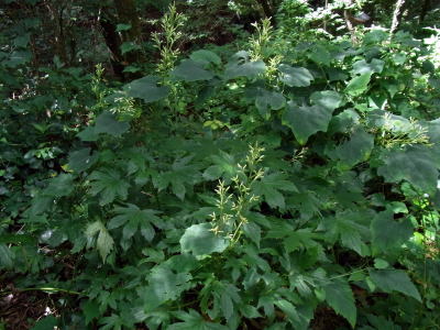 2013年8月末、高千穂峰の麓にある御池小学校近くの茂みで、群生しているモミジガサを見かけました。