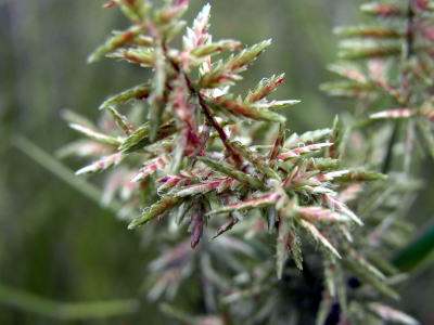近寄って観察すると、散開した花序には,長さ1.5cm位の小穂が総状にぎっしりと互生しています。