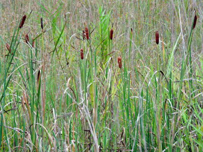 もう、ハッチョウトンボの姿は見られませんでしたが、低い草むらの向こうに穂をつけたガマが横に並んで生えているを見つけました。