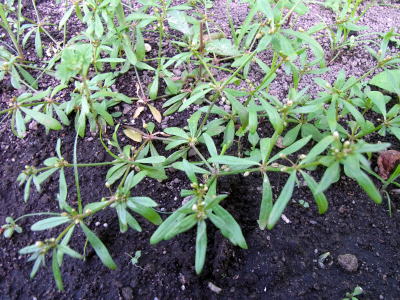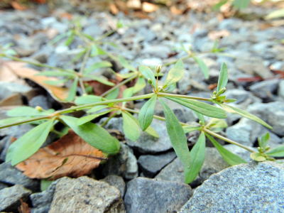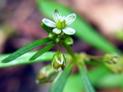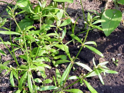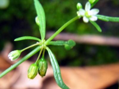 同じ科のザクロソウとよく似ていますが、 茎頂又は葉腋に集散花序であるザクロソウに対し、クルマバザクロソウは、花が葉腋に固まってつくことで区別されるといいます。