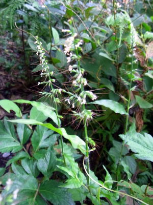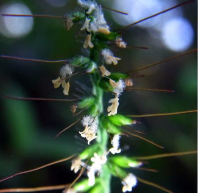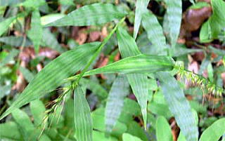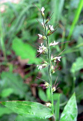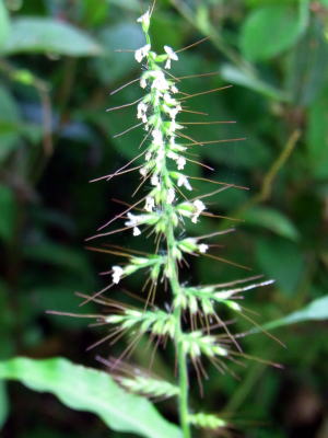 和名は、縮み笹。属名は武装した芒の意で,熟す頃,芒は粘る露を出し衣服などに粘着し,臭気がある。