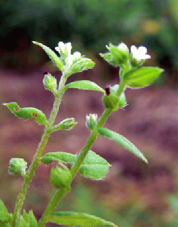 花は、春から秋,同じ仲間のワスレナグサと違って、花穂は巻かずにまっすぐ伸びます。