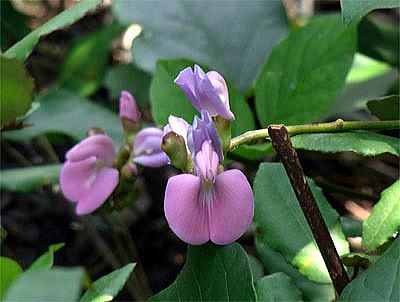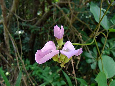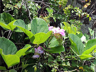 初めて見たハマナタマメの花は、独特の大きな葉の間から,淡赤紫色の花を1〜2個咲かせていました。 膨らんだ蕾は、これから順次、美しい花を咲かせることでしょう。