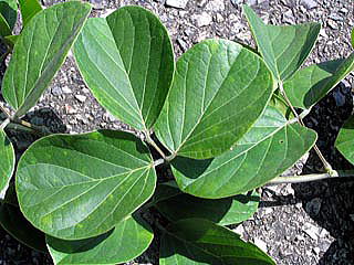 葉は、互生,長柄をもった3出複葉,厚く,小葉は長さ6〜10cm。