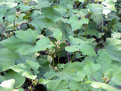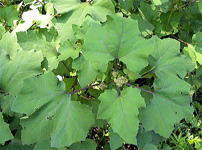 葉は、広卵形で長さ5〜15cm、幅4.5〜15cm、普通3個、ときに5個に中ほどまで裂け、基部は心形。