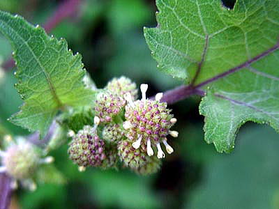 雄頭花は、葉腋から出る短い円錐花序をなし、雌頭花は、雄頭花の下につく。雄花は黄白色、雌花は淡緑色。