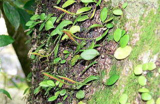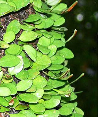 石の表面や樹皮上に生育し、細い匍匐茎からまばらに葉を付けます。