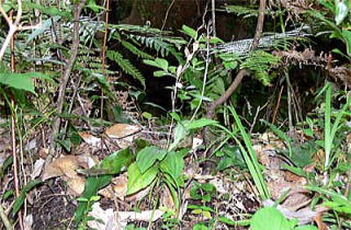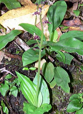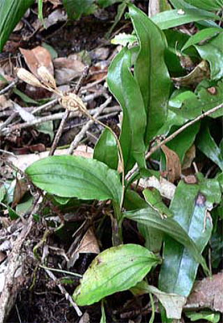 関東南部以西、四国、九州に分布、常緑広葉樹林内に生える常緑の多年草です。