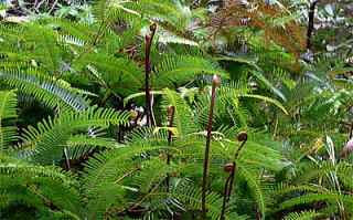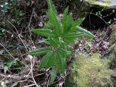 加江田渓谷では、多く見かけます。 北陸以南の日当たりの良いやや乾いた山野に生える常緑性の多年草です。 根茎は、地表近くを長く這い、葉は、まばらに立って1m以上になります。 葉面は6枚で、裏面は白色、細毛があり、鱗片はありません。 葉柄で、籠などをつくります。