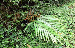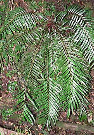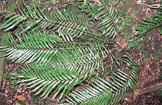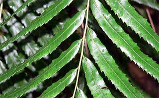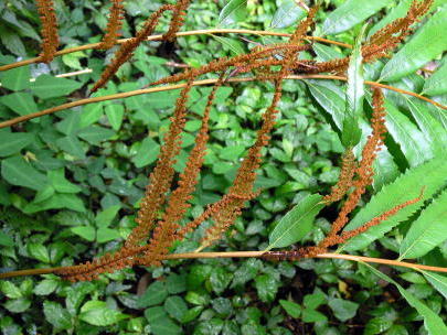 林内の湿ったところに生え、葉は単羽状で、革質の羽片には大きな鋸歯があります。