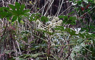 ヤツデは、庭園や公園に植栽されたものが多いようですが、海岸付近の暖帯林内に生える常緑低木で、加江田渓谷にも生えていました。