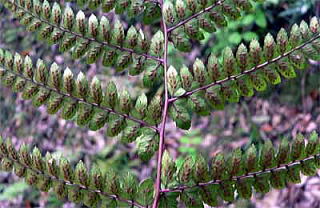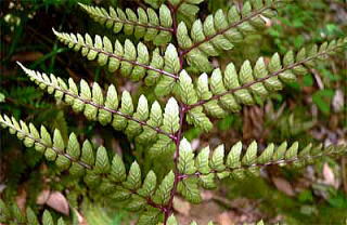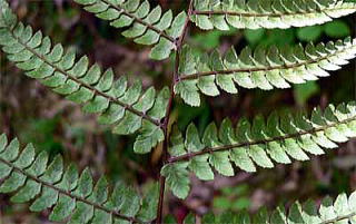 羽片と小羽片は、無柄、小羽片は他のイヌワラビ類より小さく込み合ってつきます。