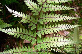 加江田渓谷はシダ類の多いことでも有名ですが、新芽や新しい葉の葉軸の色が赤みがかって、ひときわ目立つシダがタニイヌワラビです。