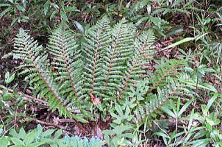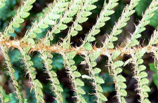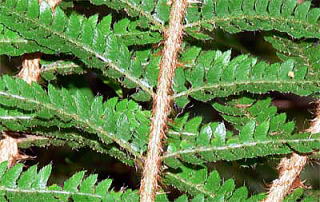 葉はやや堅く、表面は光沢があります。 裏面には毛状の長い鱗片があり、胞子嚢は中肋と辺縁の中間に付き、包膜は全縁。