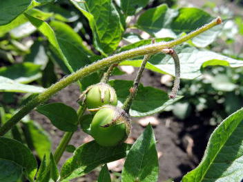 普通結実しないといわれるジャガイモですが、ほぼ花が終わったベニアカリに果実が2つだけ稔っているのを菜園でみつけました。