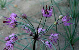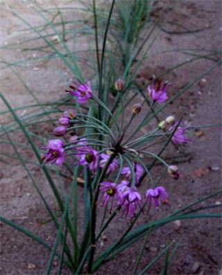 花は、晩秋、葉束から高さ40cm位の茎を1本出し、半球形で、紫色の花を散形につけます。