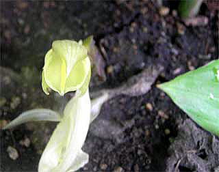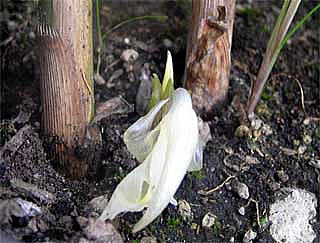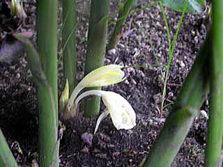 たまたま訪れた県薬草・地域作物センターの展示菜園で、若芽と花が、地中から顔を出して伸びているのを初めて見ましたので、早速、撮影しました。