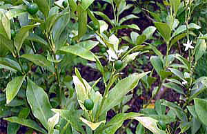 中国中南部の湖南・浙江両省の原産で、日本へは江戸時代に渡来し,暖地に果樹として栽植している常緑低木。