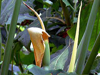 同じサトイモ科のクワズイモについても、偶然、青島亜熱帯植物園や知人宅で 花を撮影することができ、これも別ページに掲載しました。あわせてご覧下さい。
