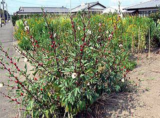 はじめて見る植物で、観賞用か、野菜なのか、また、名前もなかなか分かりませんでしたが、調べた結果、ハーブのローゼルと分かりましたので、掲載することにしました。