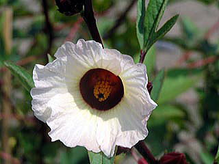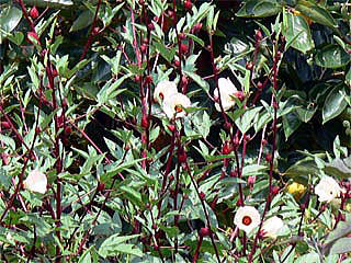ローゼルという名前は、花の形がバラに似ていることによるが、同じアオイ科の野菜のオクラの花に似ている。