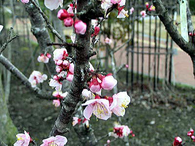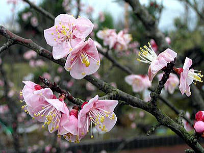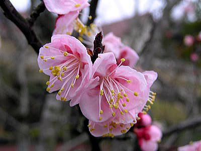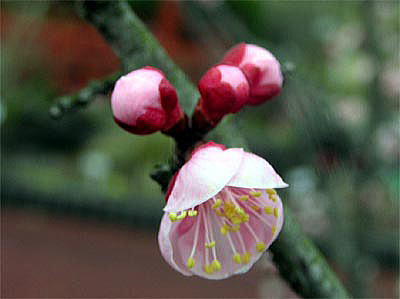 花は、春に昨年の枝につき,葉より早くに咲く。がく片は紅紫色で反り返る。