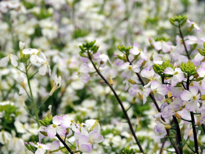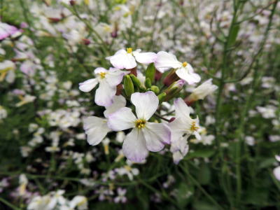 白や、紫、細長いもの、丸くて太いものなど、普通見かける大根(ダイコン)とは違う 【米良糸巻き大根】 が、県薬草・地域作物センターの展示園で一斉に花を咲かせていました。