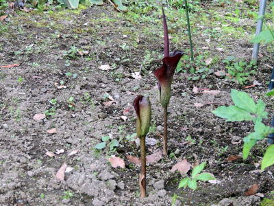 3月末、県薬草・地域作物センターを散策中、展示園のコンニャクが小さな花茎を2本出しているのに気付き、観察を続けたところ、 一月余り経過した5月初めに、ようやく花が開花しました。