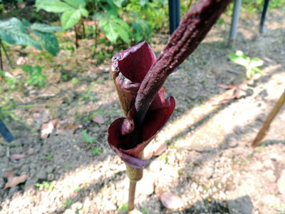 サトイモ科の花の花らしく、仏炎苞は赤味を帯びたチョコレート色ですが、思ったより悪臭はありません。